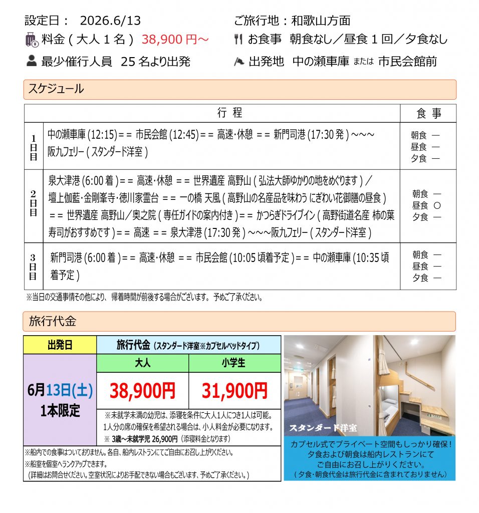 阪九フェリーで行く 世界遺産「高野山」への旅3日間